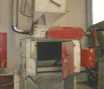 Größere Ausführung der vorhergehenden Anlage. Die Höhe der zu strahlenden Objekte kann maximal 2,8m, deren Durchmesser bis zu 2m betragen. Als Strahlmittel werden Strahlschrot und Hartgußkies verwendet.